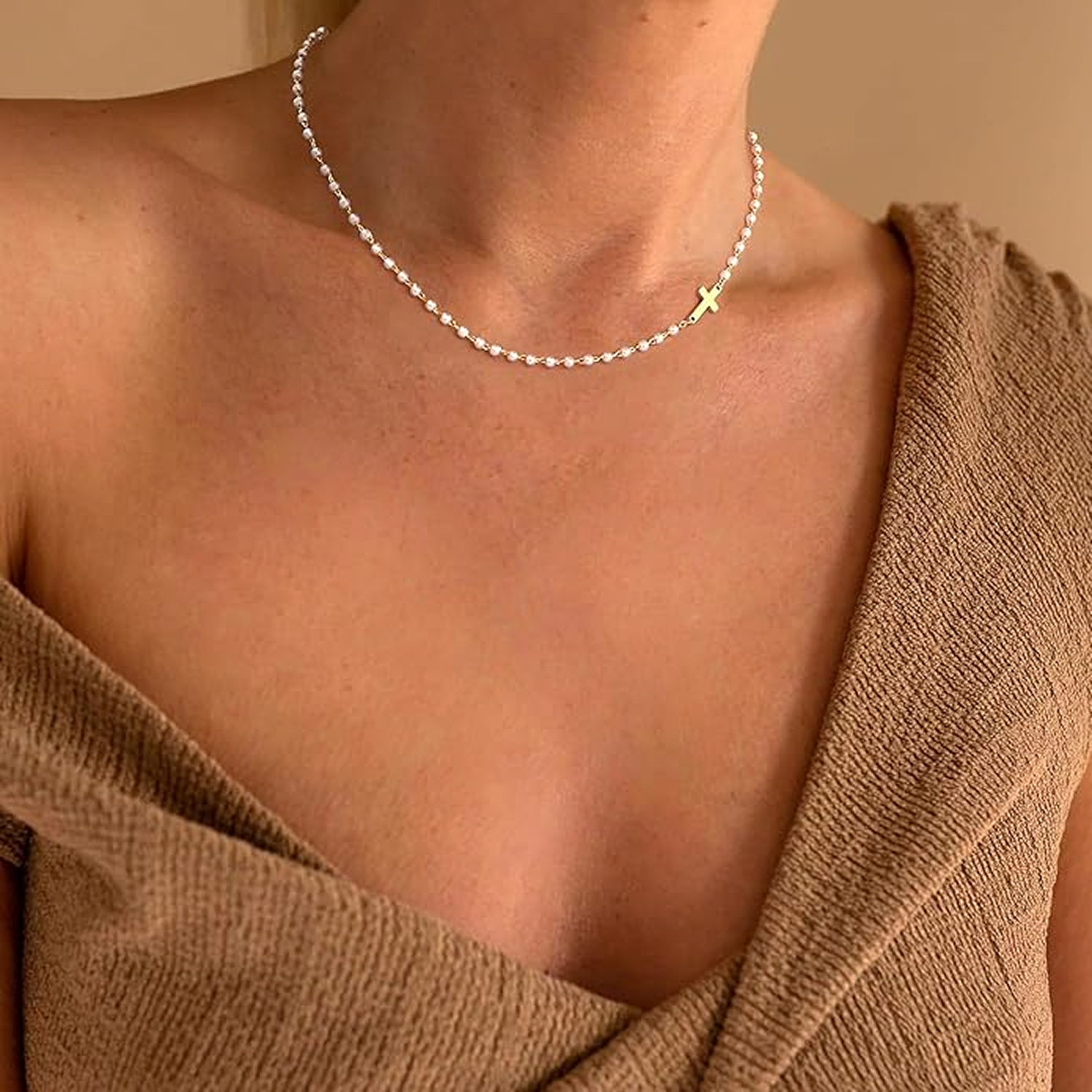 Elegant pearls and a golden cross unite in a timeless design. Crafted with 14K gold plating, waterproof and tarnish-free.